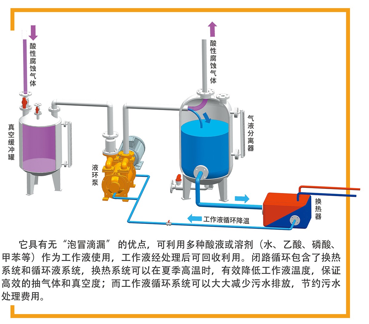 耐腐蝕液環(huán)泵可以升級(jí)為閉路循環(huán)系統(tǒng),它由FSK系列、F2SK系列、F2BV系列、F2BE系列和JZJFS羅茨泵系列,與真空換緩沖罐、汽液分離器、換熱器、連接管路等串聯(lián)組成。閉路循環(huán)與用戶DCS 連接可實(shí)現(xiàn)自動(dòng)控制。